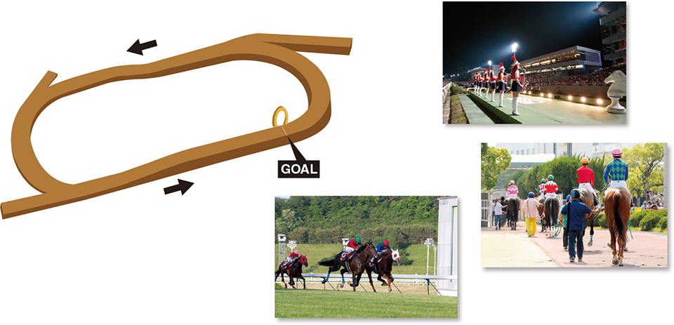 サラブレッドが1周1,000m以上のコースを右回りまたは左回りに走り、スピードを競う、普段よく目にする競馬のことを「平地競走」と言います。 地方競馬が開催されている競馬場は中央競馬が開催されている競馬場に比べ、1周の距離が短く、コーナーの角度が急なコースが多くなっており、その特徴を生かし、コーナー2つの1ターンで行われる短距離戦なども行われています。