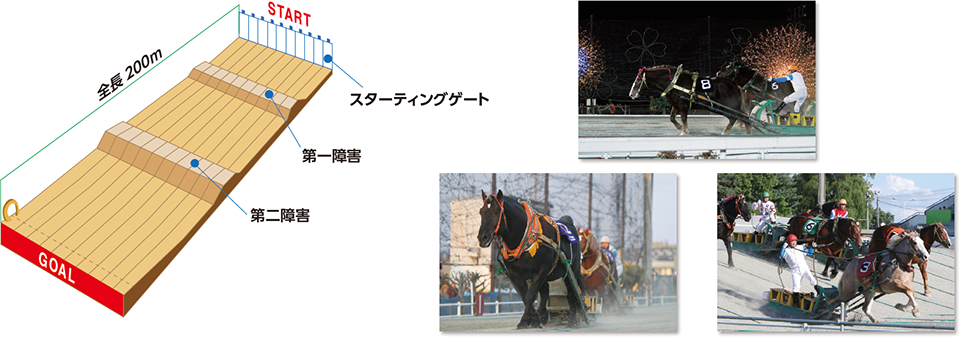 ばんえい競馬は世界で唯一、帯広競馬場でのみ開催されている競馬で、馬体重およそ1トン(サラブレッドの約2倍)もある「ばん馬」と呼ばれる大きな馬が鉄製のソリをひいて、2つの障害(台形状の山)がある直線200mのセパレートコースで、パワーとスピードを競う競馬です。