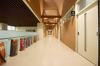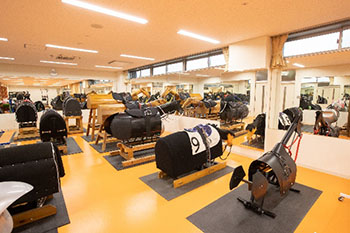 騎手候補生は、競馬場での実習中を除く、2年間の課程の大半をこの寄宿舎で生活します。平成29年にリフォームした寄宿舎内は、寝起きや自習、休憩時間を過ごす居室だけでなく、食堂、娯楽室、ガス乾燥機付き洗濯室など、生活に必要なものが揃ってます。