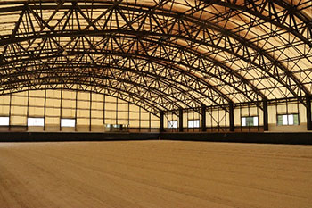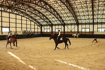 入所間もない騎手候補生の訓練や、悪天候時に活躍するのが、平成25年に厩舎地区北側に完成したテント張りの屋内馬場(テントドーム)です。1面65m×34mの広さがあり、半面ごとに区切っての訓練が可能です。