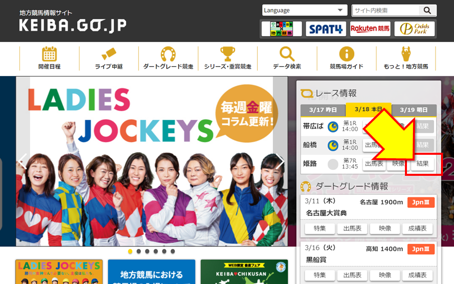 トップページ〈レース情報〉より(結果)ボタンをクリックしてください。