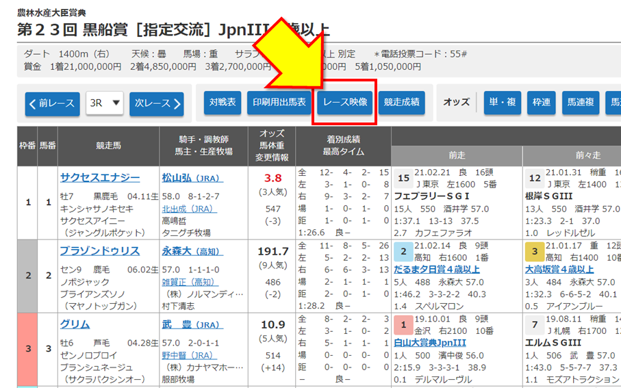 当該レースの「出馬表」より(競走成績)ボタンをクリックしてください。