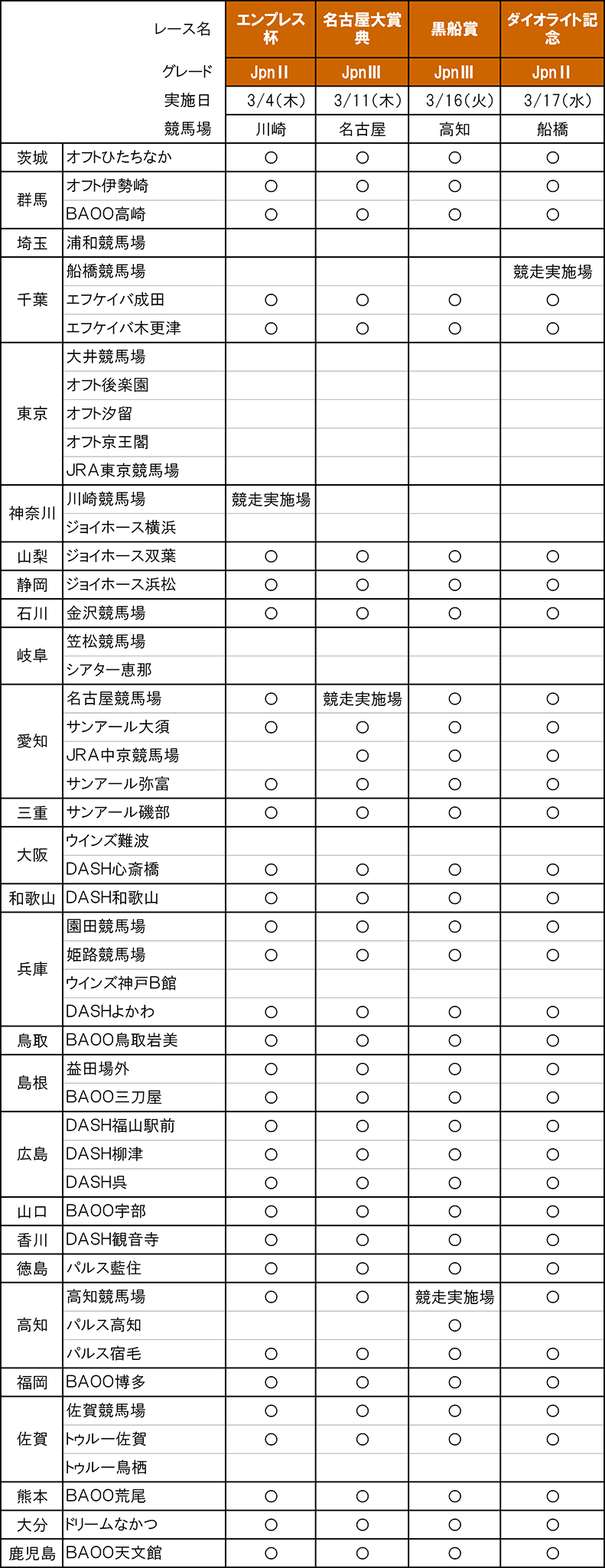 ※2021年3月開催予定の地方競馬ダートグレード競走の競馬場および場外発売施設での発売予定は、下表のとおりです。
