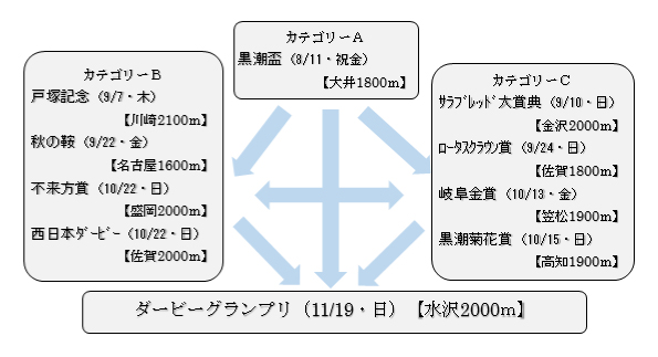 ※ダービーグランプリの出走申込み状況により、各カテゴリーの競走の優勝馬であっても出走馬に選定されないことがあります。