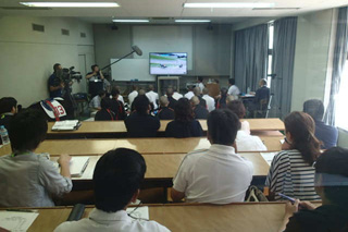 午前に模範騎乗と96期騎手候補生(来年3月修了予定)との模擬レースを行いました。午後には教室に場所を移し、プロ騎手としての心構えをテーマに、騎手候補生との座談会を行いました。
