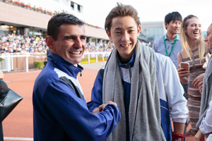 表彰式後、総合優勝のダシルヴァ騎手(左)と握手を交わす中野騎手