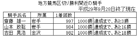 9月28日(木)終了時点で、区切り勝利が近い騎手は、以下のとおりです。