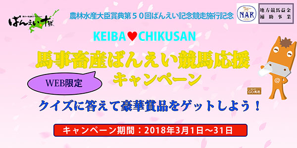畜産関係団体で構成され、畜産や畜産物の普及啓発(畜産フェア等)など諸活動を実施している馬事畜産振興協議会(事務局:公益社団法人 中央畜産会)では、第50回ばんえい記念(3/25)の開催を記念して、簡単なクイズとアンケートにご回答いただいた方を対象に、北海道産畜産物や、帯広競馬場のプレミアムラウンジ招待券など豪華賞品が当たる“WEB限定畜産フェア”「馬事畜産ばんえい競馬応援キャンペーン」を以下のサイトで実施します(実施期間:3月1日~31日)。