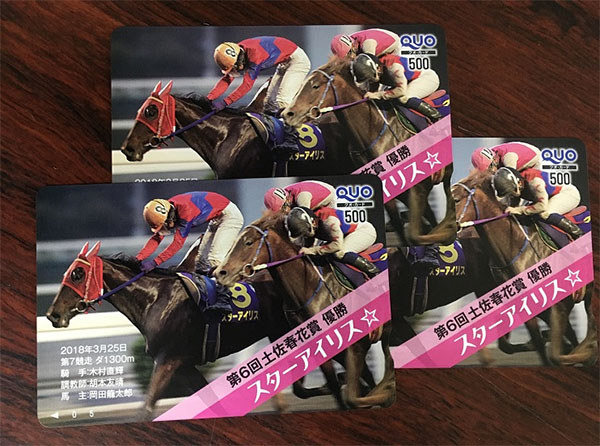 3月25日に高知競馬場で行なわれた「第6回土佐春花賞」の優勝を記念してつくられました「スターアイリス号 オリジナルQUOカード」をオーナーである岡田龍太郎様のご厚意でご提供いただきましたので、ファンの方10名様にプレゼントいたします。