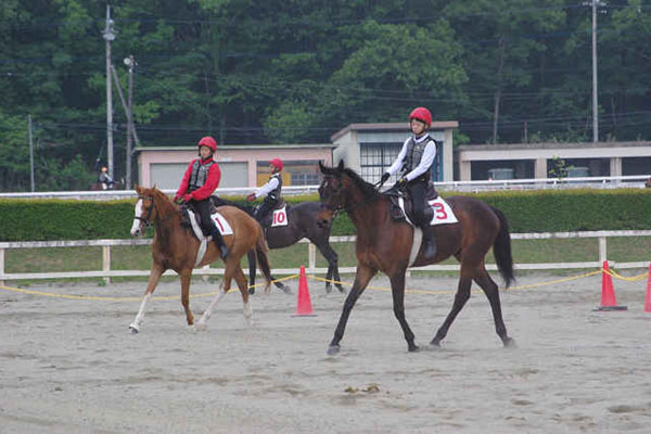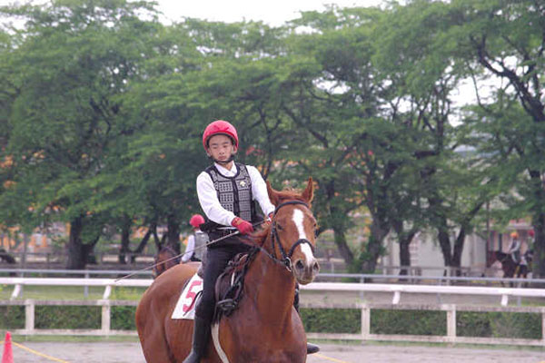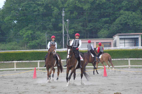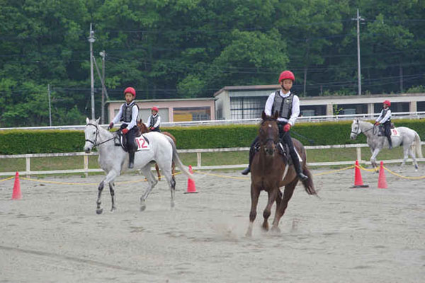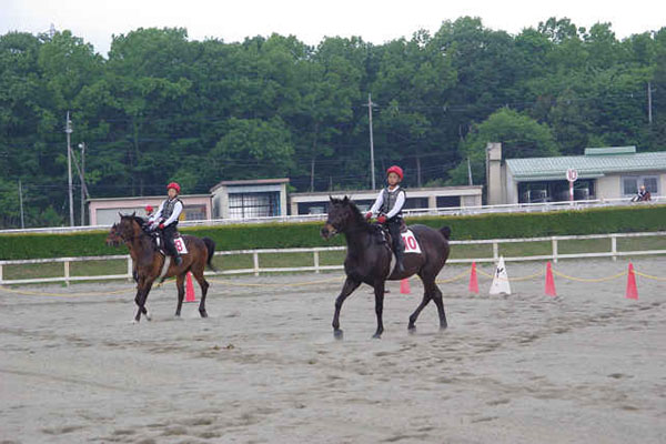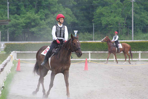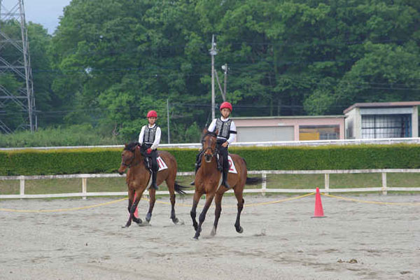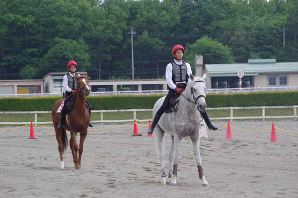 *1)扶助操作…騎手が手綱(たずな)・脚(きゃく)・騎座(きざ)を使って自分の命令を伝える方法で、人と馬との約束事になっています。手綱・脚・騎座の3つを主扶助(しゅふじょ)、音声(舌鼓(ぜっこ)・かけ声)・拍車(はくしゃ)・鞭(むち)などは副扶助(ふくふじょ)と呼ばれています。