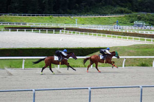 僕たち98期は、8月17日に2回目の発走から追い込みの訓練を行いました。これまでは1頭での走行(単走)でしたが、今回は初めて*1)二騎併走で行いました。