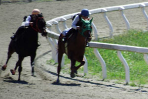 コーナーで膨らまず、直線に真っ直ぐ入ることが出来ました。しかし、直線の前半は手綱の詰め替えがスムースに出来ず、*1)ハンドライドや*2)見せ鞭を馬の動きに合わせることが出来ませんでした。最初から後半まで、馬に合わせて追えるようにしていきます。