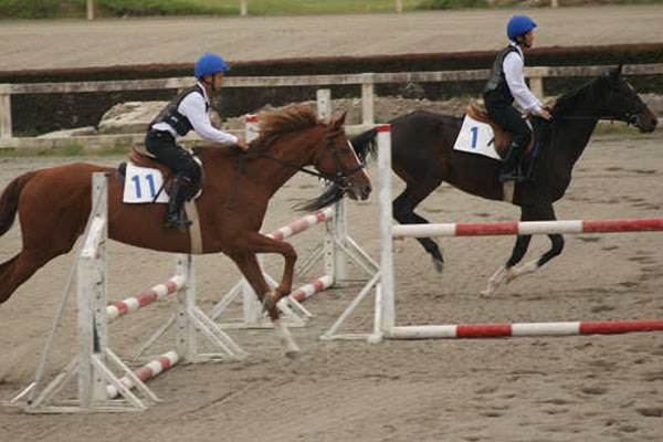 カドリールの次は、2人1組で障害飛越を行いました。2人が交差するように障害を飛越し、2頭併せて連続した5つの障害を飛越しました。