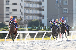 本日の第1戦は木之前騎手騎乗のモダンガールが後続に5馬身をつける圧勝。別府騎手は3着、宮下騎手は7着でした。第2戦も、3コーナー手前で先頭に立った木之前騎手騎乗のエスペレラヴニールが、追ってくる後続を突き放し勝利しました。2馬身半差の2着に別府騎手、3着は宮下騎手でした。