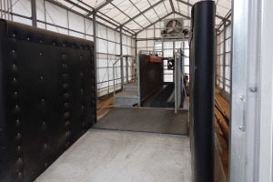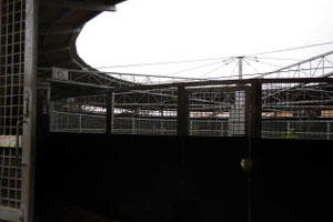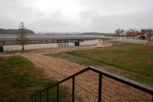 厩舎の近くには、8頭入るウォーキングマシンがありました。ウォーキングマシンとは、仕切りで区切られたスペースの中に馬を入れ、機械を回転させることで馬を運動させる機械です。ウォーミングアップやクールダウンなどのために使用します。中は馬の気が散らないように、外が見えないゴムマットで周りを隠し暗くなっており、地面はウッドチップになっていて、脚の負担が軽減されていました。