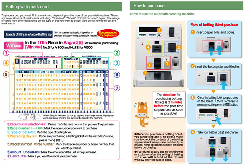 賭け式の概要、マークカードの記入方法、オッズの見方、自動発売機の使用方法など馬券購入のために必要な情報を掲載しています。