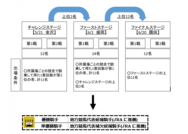 本年から各ステージ名称を、「チャレンジステージ」「ファーストステージ」「ファイナルステージ」と一新し、優勝者は8月24日(土)、25日(日)にJRA札幌競馬場で実施される『2019ワールドオールスタージョッキーズ』(国際騎手招待)の地方競馬代表候補騎手に選定されます。(準優勝者は地方競馬代表補欠候補騎手)