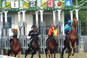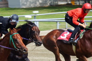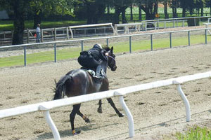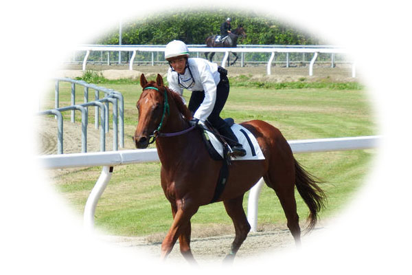 今回の実技試験では、状況判断し上手くコース取りができました。追い込みもリズム良く低い姿勢で追えたと思います。課題は元々ゲートの出がよくない馬でしたが、今回もジャンプ発走(ゲート内の駐立状態に難がある馬で、後肢でジャンプするように発進してしまうこと。写真参考)してしまったので、上手く出せるようにしていきたいです。