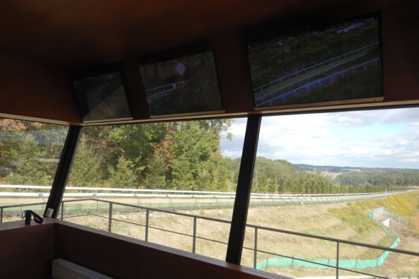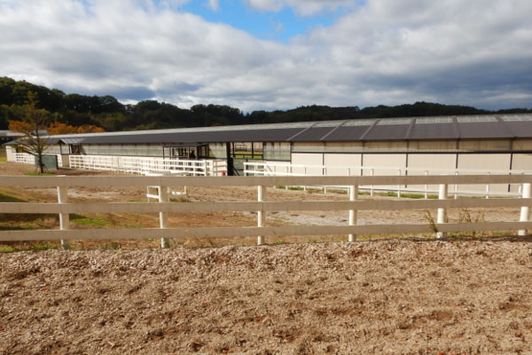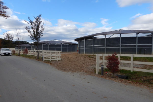 まず、最初に走路を見に行きました。走路は一つのコースに内側と外側で分かれていて、内側はダートコースで主にハッキングで使い、外側はウッドチップで主に速いスピードで走るように分けられています。