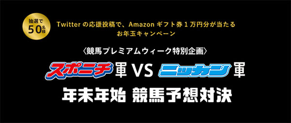 競馬プレミアムウィーク特別企画として、スポーツニッポンと日刊スポーツがスペシャルな予想対決『スポニチ軍VSニッカン軍 年末年始競馬予想対決』を開催!競馬プレミアムウィーク中に行われる下記の地方競馬のレースを対象に予想対決を行います(全11競走)。さらに、Twitterでいずれかのスポーツ紙の対象アカウントをフォローして応援すると、両紙の予想成績に応じて最高200名様にAmazonギフト券1万円分をプレゼント!