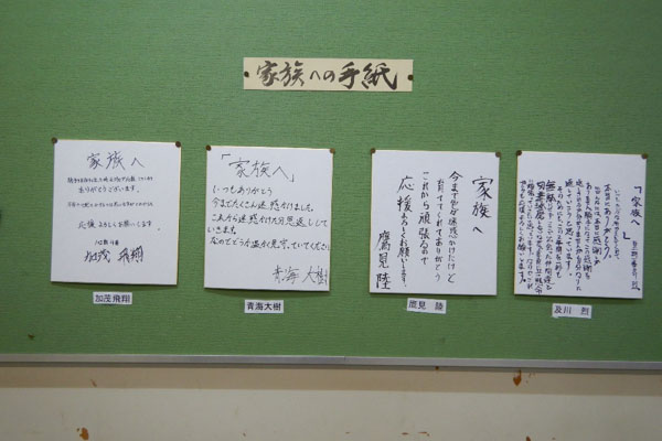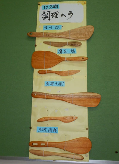 文化祭は、100期生の先輩を除いた101期、102期生が一般教養の授業の一環で作成した①絵手紙、②家族への手紙、③習字、④俳句、⑤調理へラの5点について、作品を展示して、先生方の投票で1位を決めました。