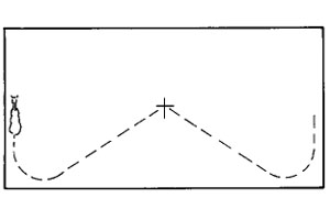 ※4往復手前変換…蹄跡から斜めに入って馬場の中央まで行進し、図のようにまた元の蹄跡に戻る運動です。駈歩における手前維持の扶助の練習に効果的です。