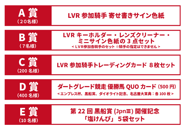 競馬場本場での観戦を楽しみにされていたお客様に向け、ミカエル・ミシェル騎手を含むLVR参加騎手寄せ書きサイン色紙や地方競馬オリジナルQUOカード(500円)等が当たるお客様感謝キャンペーンを実施いたします。