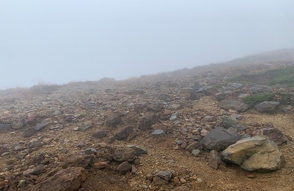 那須登山の道は、ゴツゴツした岩が沢山あり、頂上に近づくにつれて気温も下がり、雪も少し残っていました。