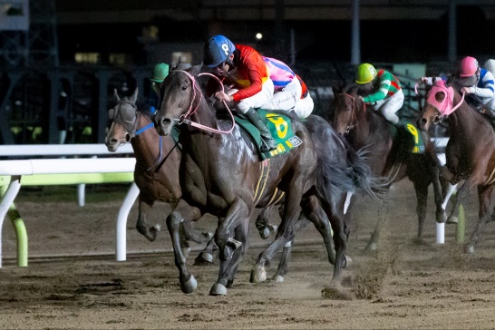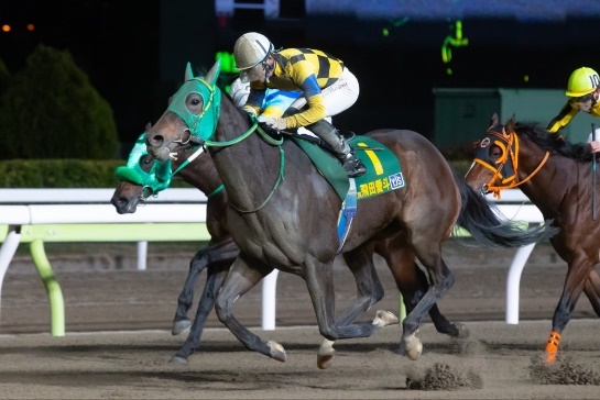 ダート1,800mで行われた第1戦は、ライヴクッキー号に騎乗した篠谷葵騎手(船橋)が大外から追い込んで3頭横並びの接戦を制しました。2着はイルフェソレイユ号騎乗の西谷凜騎手(JRA)、3着はホッコーマイサン号騎乗の菅原明良騎手(JRA)が入りました。