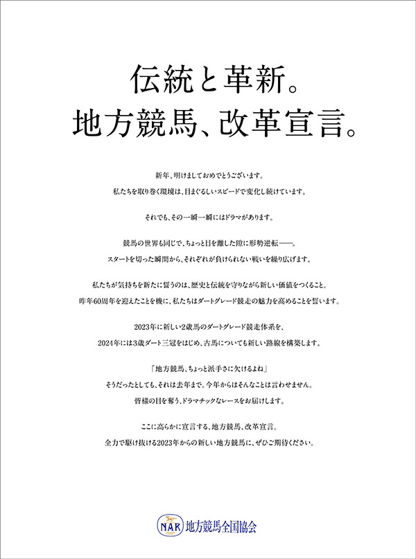 2023年より始動するダート競走の新体系に向けた地方競馬としての所信表明を、本日(1/4)付の朝日新聞・朝刊に掲出しました。
