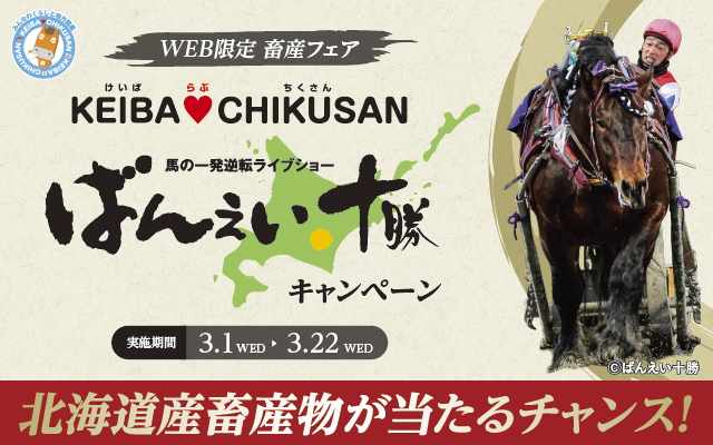 3月20日(月)に行われる「第55回ばんえい記念」の開催を記念して、1万円相当の十勝和牛や、ばんえい十勝オリジナルグッズセットなどが抽選で総計80名様に当たる「ばんえい十勝キャンペーン」を実施します。